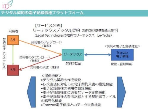 同社の電子契約は一般的な電子署名を利用するサービスとは異なり、電子署名に加えて法人間の商取引を対象にした電子記録債権法を基にしている。契約書ファイルを暗号化して、電子記録債権のデータとして記録する。電子記録債権法は電子記録債権の成立時に債権者と債務者の双方に意思確認を行うことを求めるため、もし紛争が起こっても形式的な証拠力が認められやすいという。