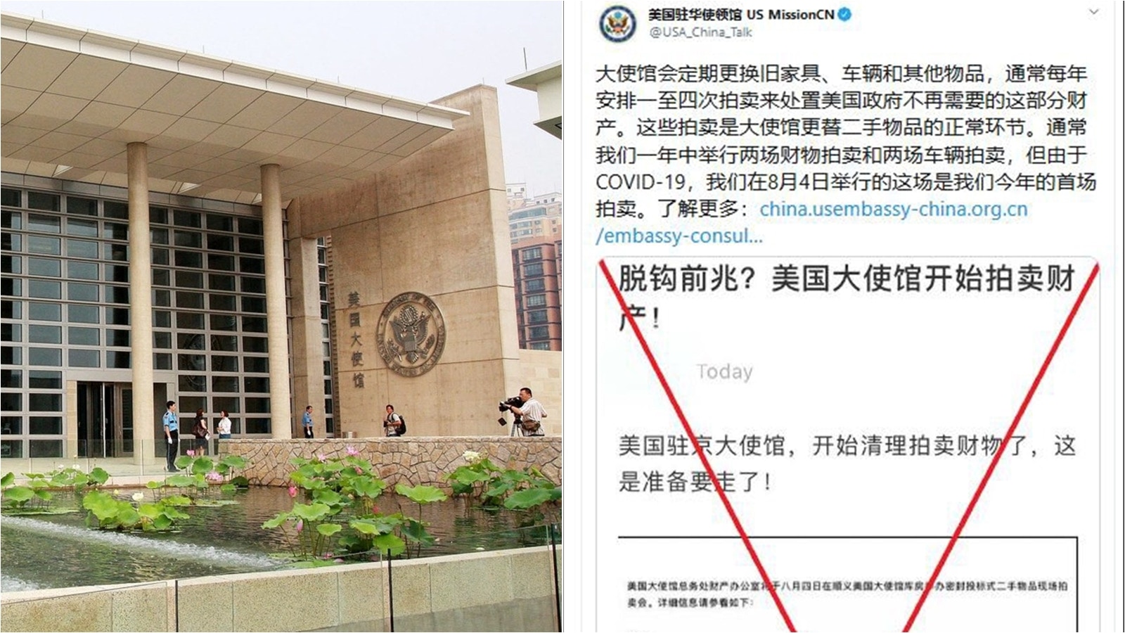 美國駐華大使館的官方微博稱:「大使館會定期更換舊家具、車輛和其他物品,通常每年安排一至四次拍賣來處置美國政府不再需要的這部分財產。這些拍賣是大使館更替二手物品的正常環節。通常我們一年中舉行兩場財物拍賣和兩場車輛拍賣,但由於COVID-19,8月4日的這場是今年的首場拍賣。」